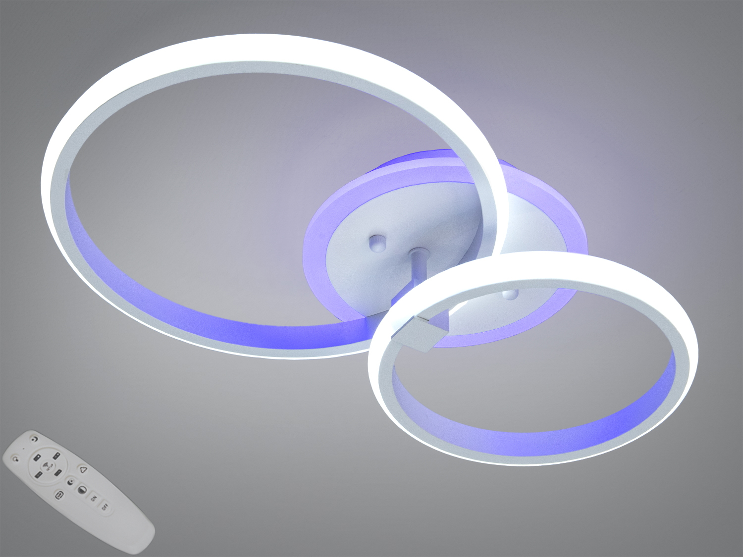 Люстра оснащена пультом для швидкої зміни яскравості та сценаріїв освітлення. Основне світло забезпечує яскраве біле сяйво для щоденних завдань, а триколірна підсвітка основи дозволяє обрати один із трьох відтінків (включно з білим) для вечірнього акценту або м’якого підсвічування. Димер допомагає налаштувати комфортну освітленість під перегляд фільмів, читання або роботу за столом. Потужності 80 W зазвичай достатньо для кімнат площею близько 12–14 м², а чотири модулі рівномірно розподіляють світло без різких тіней.