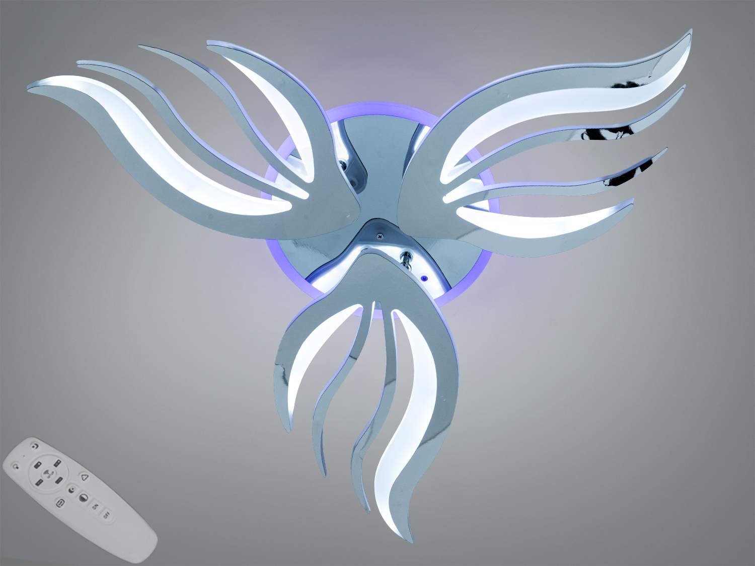 Світильник з дистанційним керуванням, має хвилясті елементи, що нагадують полум′я. Підсвічування фіолетового кольору додає стильний акцент.Стельовий світильник з хвилястими елементами, що створюють ефект руху. Ідеально підходить для сучасного інтер′єру.Декоративний світильник з червоним підсвічуванням, що підкреслює хвилястий дизайн. Підходить для монтажу на стелі.Стельова LED люстра з пультом 145 Вт біла 25 м²Стельова LED люстра з пультом 145 Вт біла 25 м²