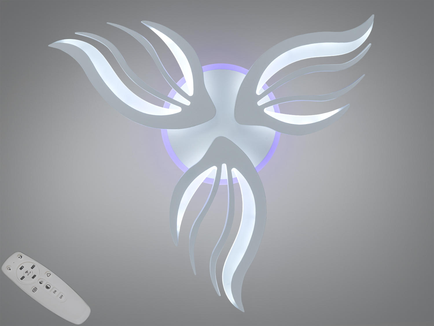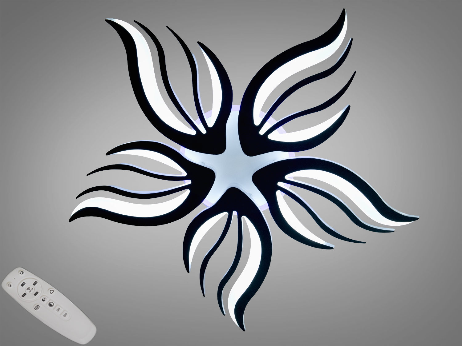 Стельова LED люстра 145 Вт у білому виконанні поєднує динамічні хвилясті елементи з функціональністю сучасного освітлення. Пластичні форми і декоративні лінії нагадують полумʼя або пелюстки, а акцентне кольорове підсвічування створює виразний настрій у кімнаті. Модель передбачає дистанційне керування, регулювання яскравості та зміну температури світла, що допомагає підлаштувати освітлення під різні сценарії щодня.
