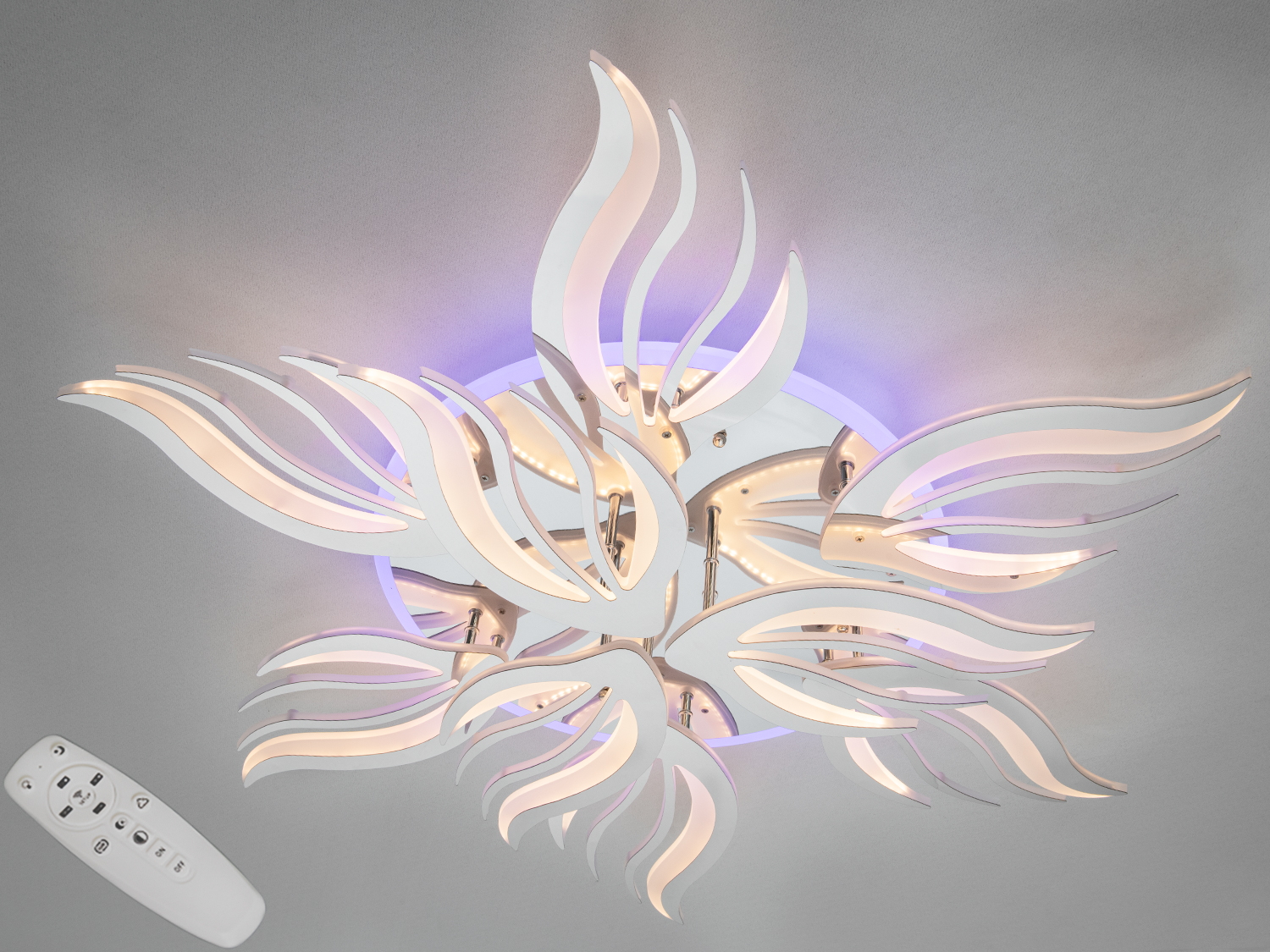 Стельова LED люстра 145 Вт у білому виконанні поєднує динамічні хвилясті елементи з функціональністю сучасного освітлення. Пластичні форми і декоративні лінії нагадують полумʼя або пелюстки, а акцентне кольорове підсвічування створює виразний настрій у кімнаті. Модель передбачає дистанційне керування, регулювання яскравості та зміну температури світла, що допомагає підлаштувати освітлення під різні сценарії щодня.