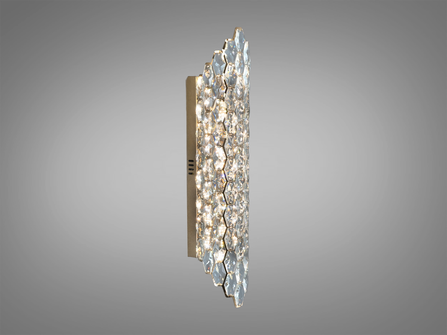 Конструкція поєднує квадратну настінну платформу з каскадом прозорих кристалів ромбічної форми. Зібрані у щільні вертикальні нитки, вони формують циліндричний об’єм із привабливою грою світла. Хром забезпечує дзеркальний ефект без візуального перевантаження, що доречно для сучасного, класичного або готельно-резиденційного інтер’єру. Компактна глибина конструкції виглядає акуратно на стіні й дозволяє розміщувати бра парами або серіями.