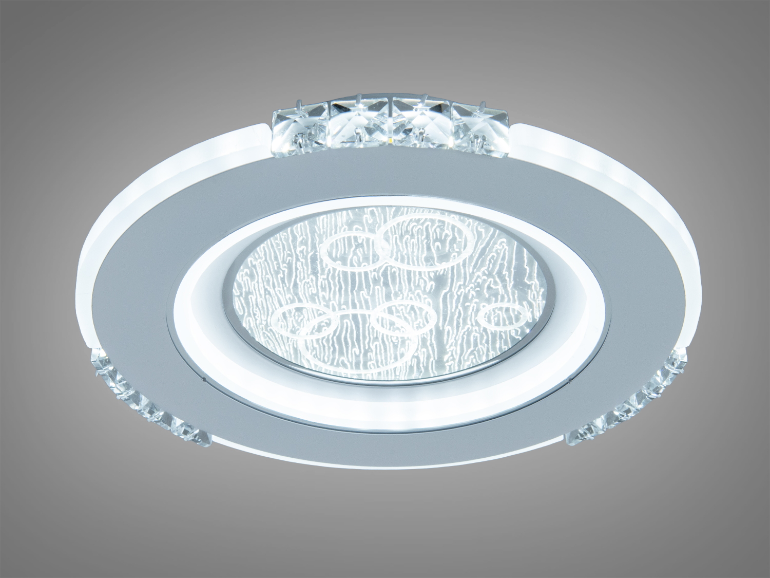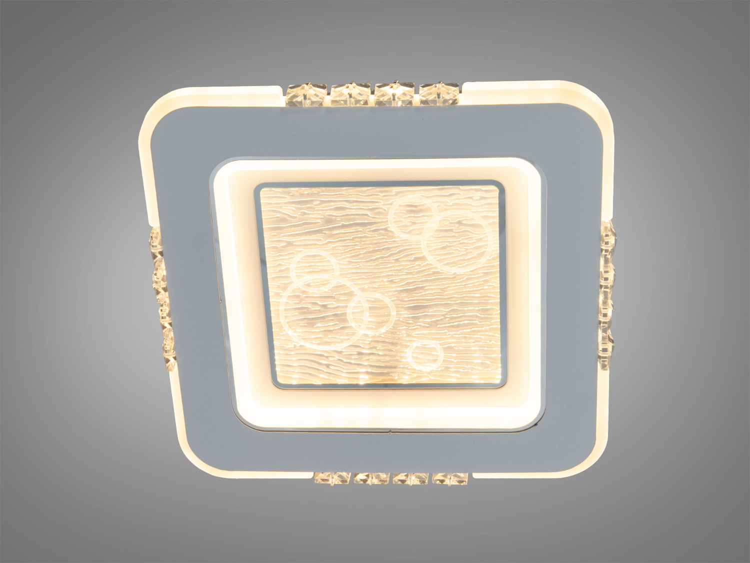 Корпус виконано у білому кольорі, що візуально освіжає приміщення. Квадратна форма впорядковує композицію стелі та добре поєднується з геометрією сучасних просторів. Матовий розсіювач пом′якшує світловий потік, а прозорі декоративні вставки з кришталевим ефектом додають виразності, не перетягаючи увагу. Накладний тип кріплення дозволяє встановлювати світильник без підвісних конструкцій, що зручно для житлових та комерційних об′єктів.