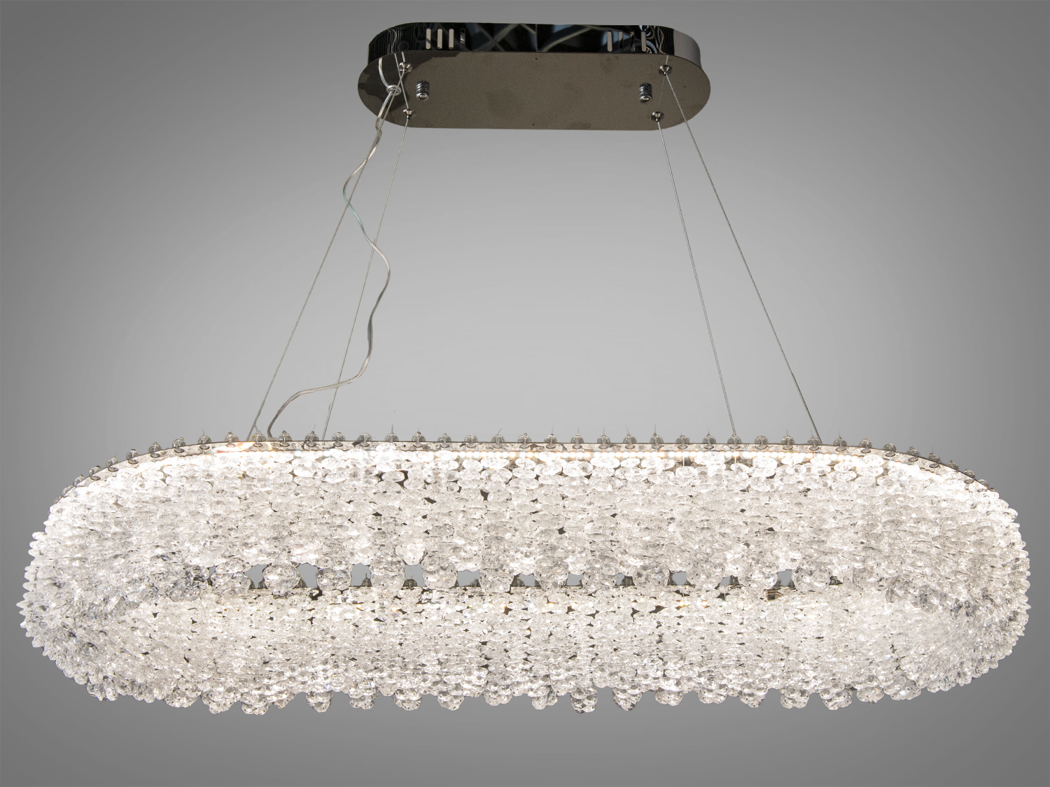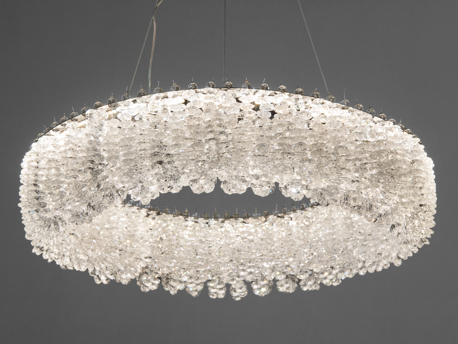 Люстра виготовлена з високоякісного хрому і прозорого кришталю, що створюють вражаючий ефект блиску. Її дві кільцеві конструкції прикрашені кришталевими підвісками, які віддзеркалюють і розсіюють світло по всій кімнаті, створюючи атмосферу тепла і затишку.