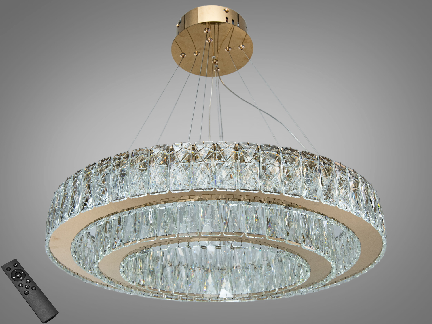 Ця підвісна кришталева LED люстра поєднує декоративний потенціал двох овальних рівнів та практичність керування пультом. Три колірні температури допомагають адаптувати світлову сцену під різні сценарії, а світлового потоку вистачає для кімнат орієнтовно до 15 м². Якщо потрібен інший відтінок фурнітури, у серії зустрічається варіант у хромі.