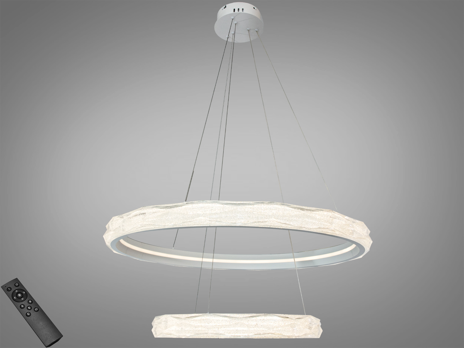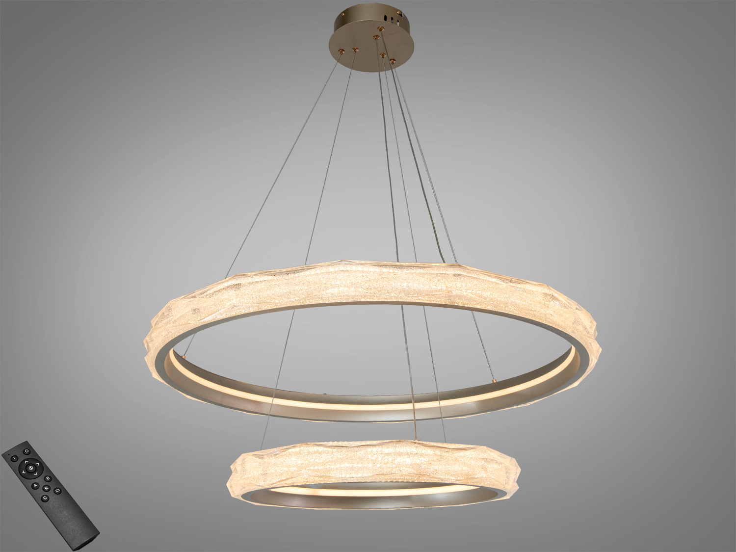 Переваги моделі полягають у поєднанні потужного світлового потоку, візуально легкої підвісної конструкції та практичності дистанційного керування. Кільця розташовуються на різних рівнях, що дозволяє підкреслити вертикальний об’єм кімнати. Холодне біле світло зазвичай сприяє концентрації та чіткості сприйняття деталей інтер’єру, що доречно для робочих і загальних зон.