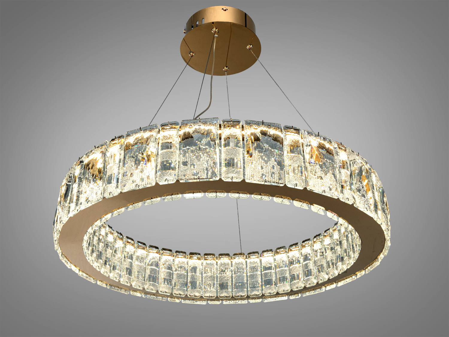 Кільцева форма з прозорими кришталевими елементами створює розсіяний, м’який потік світла без різких тіней. Підвіс на тонких тросах візуально полегшує конструкцію та, залежно від монтажу, може допомагати точно розмістити світильник над центром кімнати або зоною. Каркас виконаний з металу, кільце — з кришталю, що додає виразної іскристості під час увімкнення. Хромоване покриття зазвичай гармоніює з більшістю сучасних відтінків фурнітури та техніки.