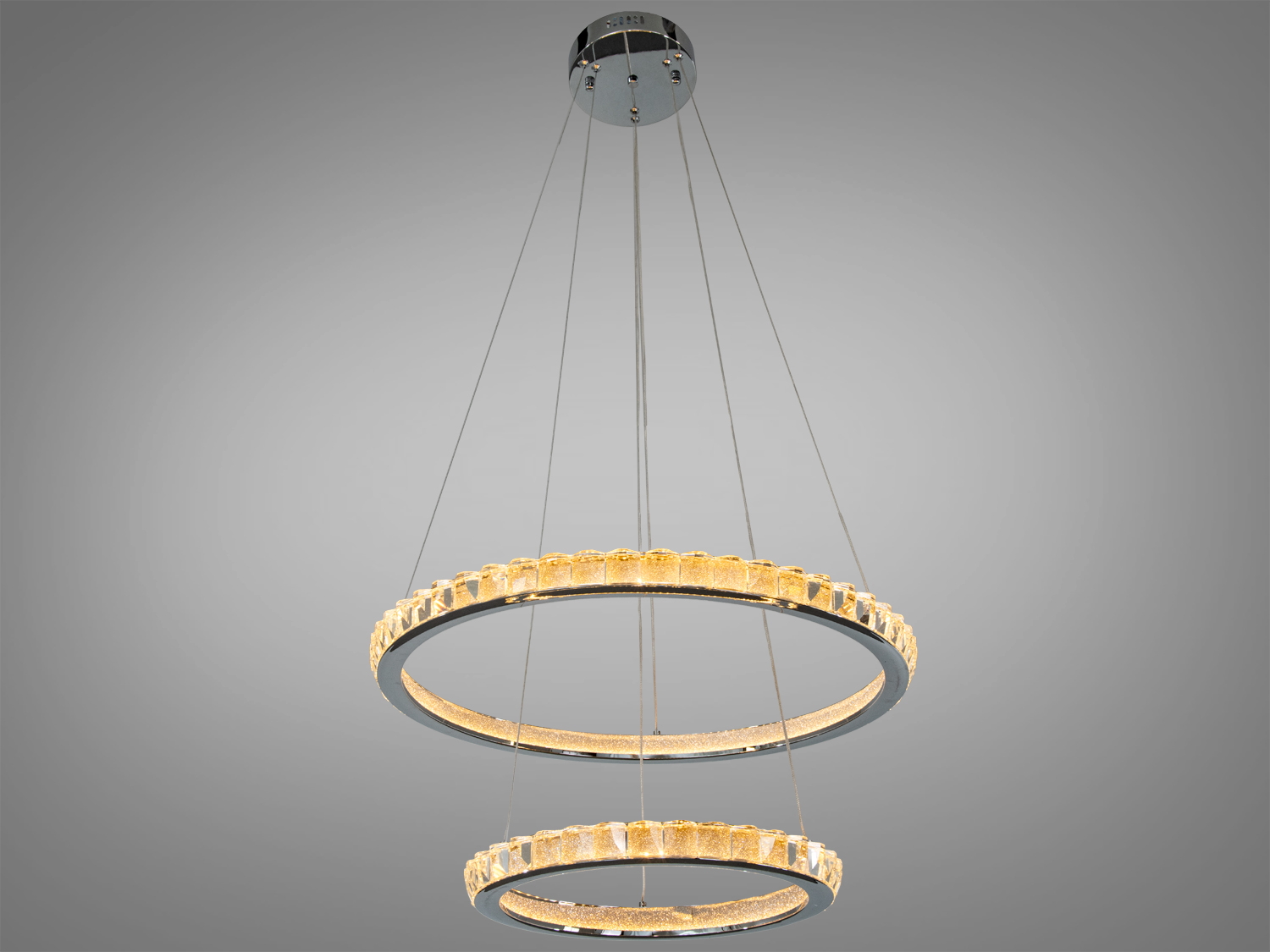Світильник складається з трьох світлових модулів-кілець, підвішених на тросах. Хромоване покриття металевого каркаса поєднується з акриловими розсіювачами, завдяки чому світло виглядає м’яким і рівномірним. Лаконічна геометрія підтримує сучасні інтер’єрні рішення — від мінімалізму до хай-теку. Легка конструкція зменшує навантаження на стелю.
