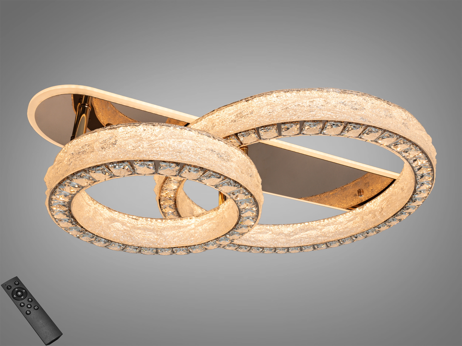 - Характеристики: вказані режими 3200К/4100К/6500К і керування пультом відповідають моделі з трьома акриловими кільцями та кришталевими вставками знизу кілець.