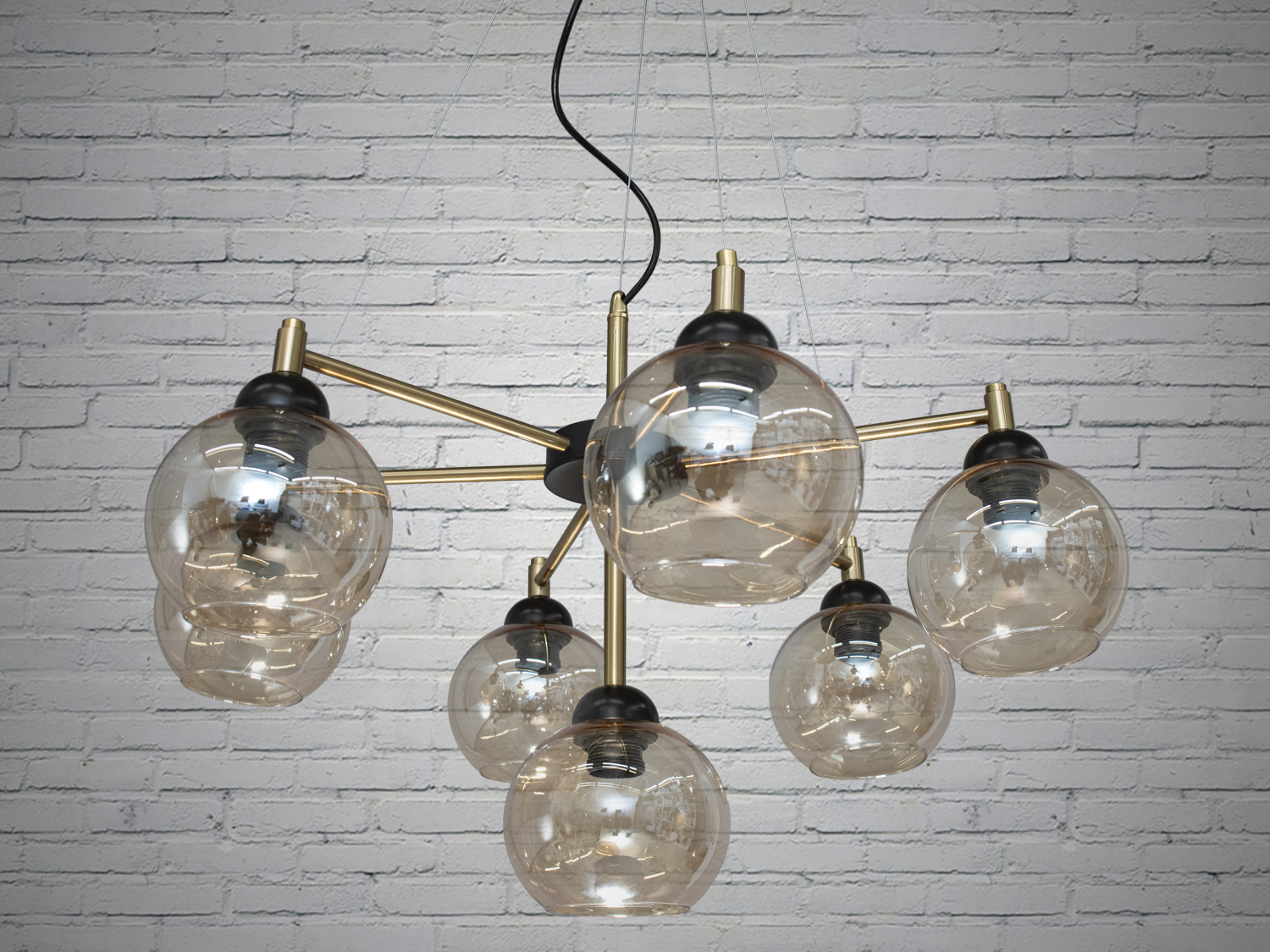 Цей освітлювальний прилад, що підтримує п’ять ламп Е27, демонструє ідеальне поєднання функціональності та стильного дизайну. Чорний металевий каркас люстри з золотистими акцентами додає їй вишуканості та сучасного шарму, а великі, димчасті прозорі скляні кулі розсіюють світло, створюючи теплу та затишну атмосферу в приміщенні.
