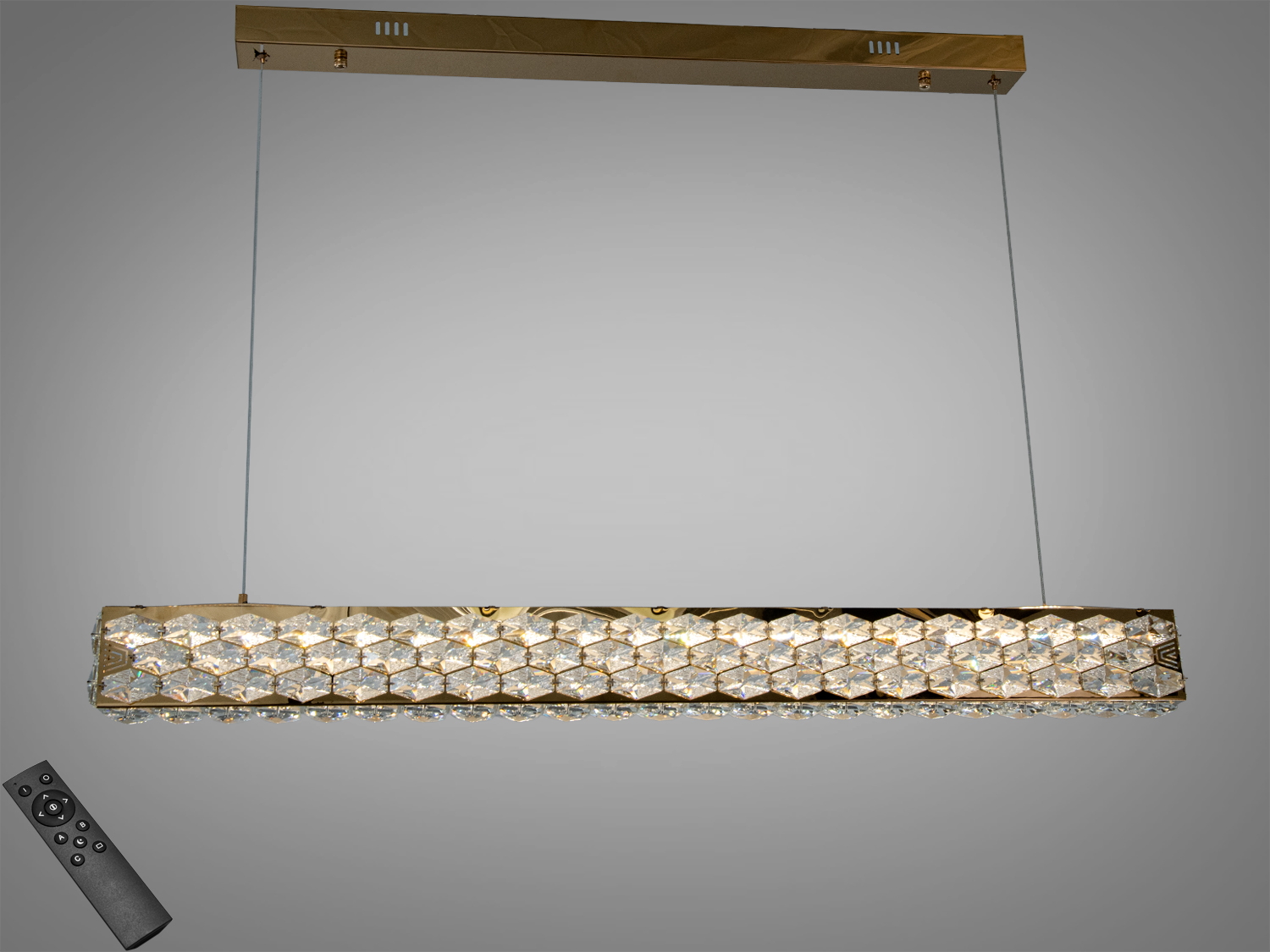 Світильник підвісний з кришталевими елементами, прямокутна форма, дистанційне керування, підходить для сучасного інтер′єру.Підвісний світильник з кришталевими деталями, прямокутний дизайн, підвіска на двох тросах, ідеальний для вітальні.Прямокутний підвісний світильник з кришталевими вставками, металевий монтажний елемент, підходить для кухні.Люстра LED підвіс кришталева хром 68Вт пультЛюстра LED підвіс кришталева хром 68Вт пульт