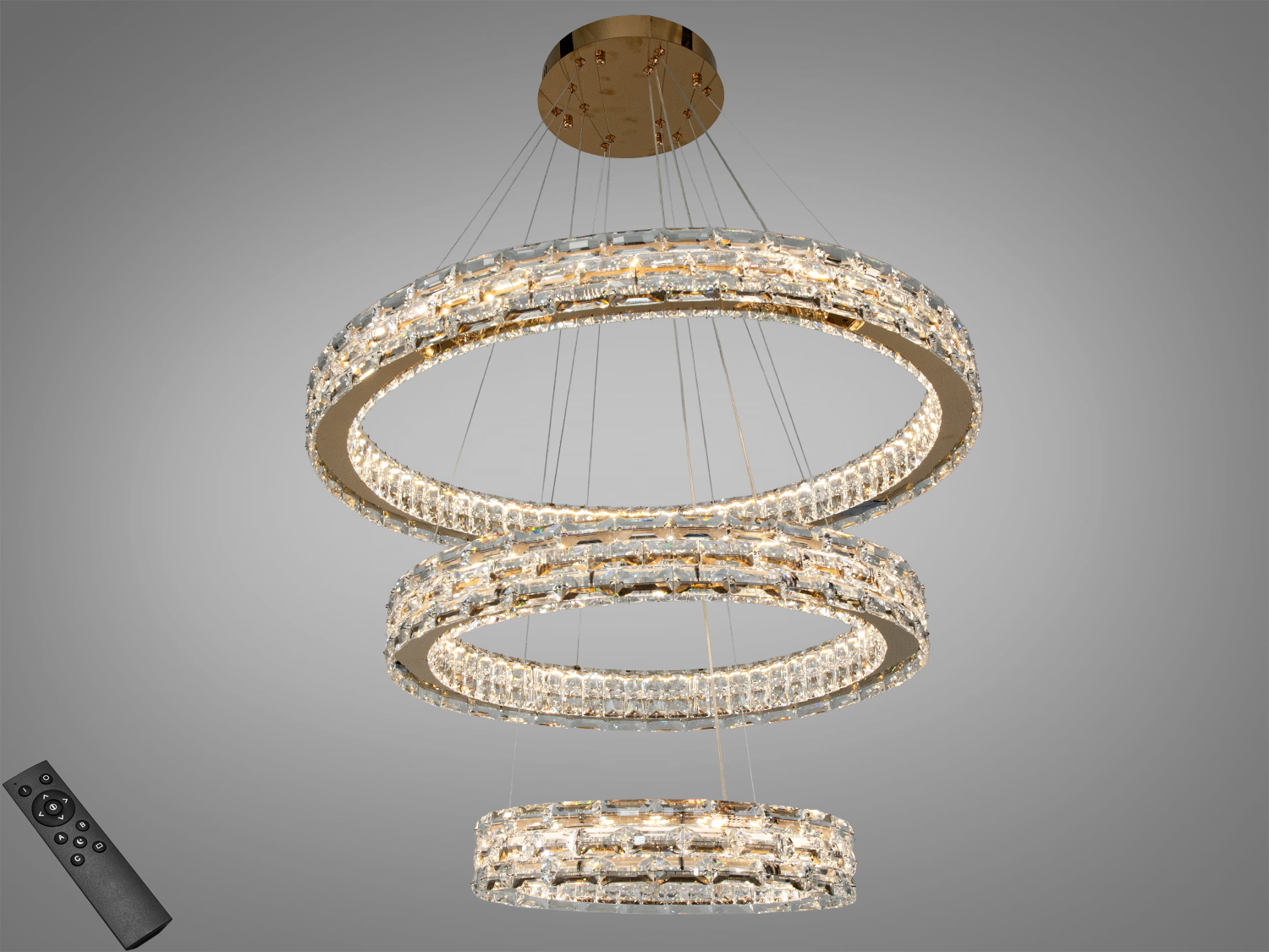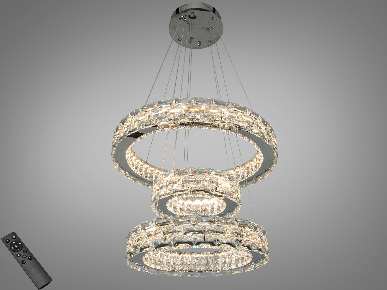 Підвісна кришталева LED-люстра із трьома світловими модулями та пультом дистанційного керування створює об’ємну світлову композицію для кімнат площею до близько 12 м². Завдяки каскадній підвісній конструкції та прозорим елементам кільця формують виразне сяйво і м’яко розсіюють потік світла. Колір: хром — стриманий і універсальний для сучасних просторів.