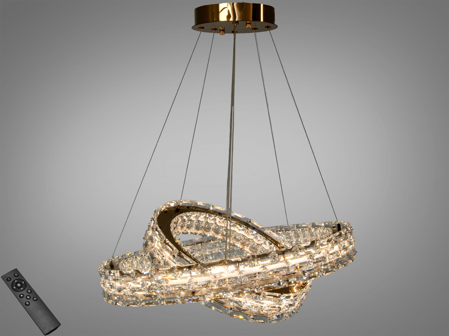 Зовнішній вигляд поєднує три кільця з прозорими кришталевими вставками, які підсилюють світлову графіку. Хром підкреслює сучасність і доречний поряд із холодними та нейтральними відтінками інтер’єру, склом, бетоном, каменем або глянцевими фасадами.