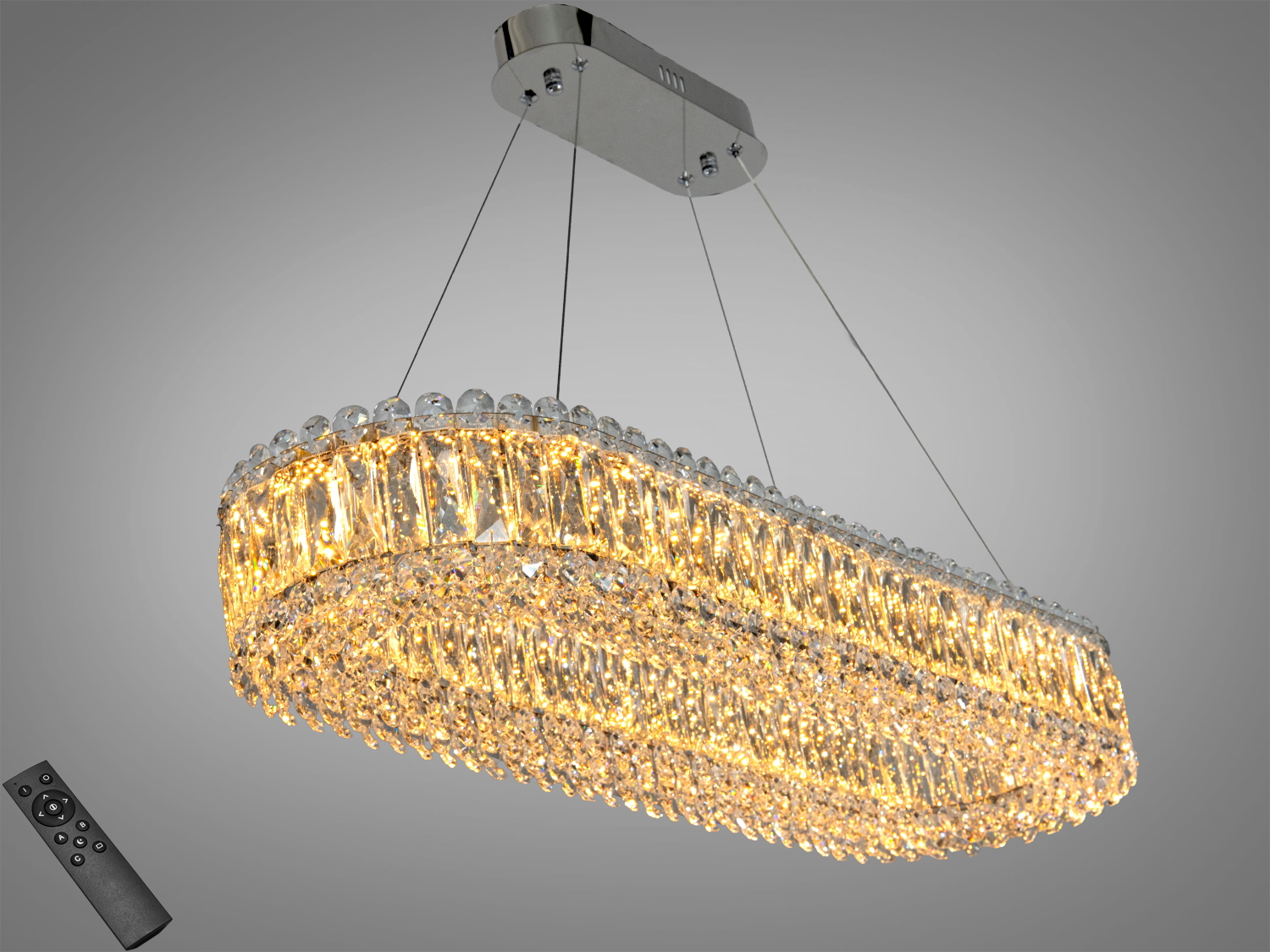 Світильник побудовано на металевій основі з хромованим покриттям, яке візуально поєднується з нержавіючою технікою та сучасною фурнітурою. Кришталеві елементи діють як оптичні призми: світловий потік м’яко проходить крізь грані, створюючи виразний блиск без надмірної яскравості. Конструкція підвісу передбачає регулювання висоти під час монтажу, тож його зручно адаптувати як для стандартних, так і для вищих стель. Догляд зводиться до періодичного протирання сухою серветкою; для кришталю бажано використовувати м’які засоби без абразиву.