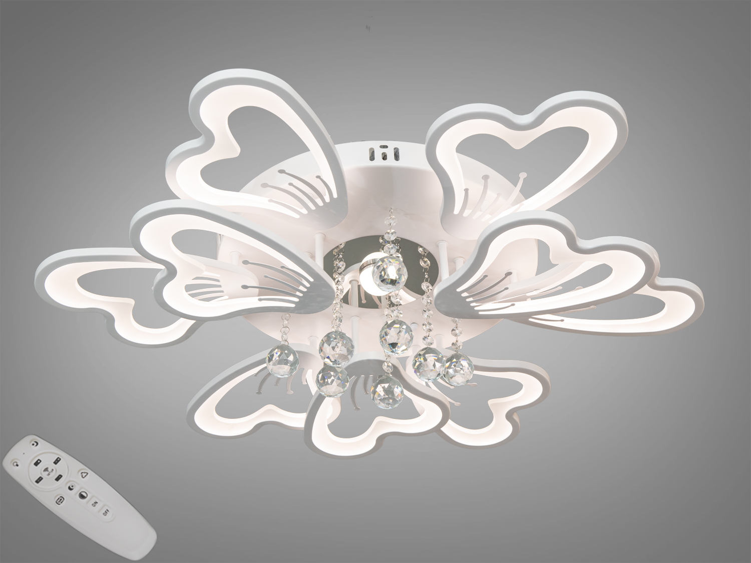 Стельова LED люстра в білому кольорі з 5 пелюстками та димером створює м′яке загальне освітлення для кімнат близько 13 м². Конструкція з пелюстками у формі серця формує силует, що нагадує метелика, а по центру розміщені декоративні акрилові підвіси у вигляді камінчиків. У комплекті передбачено керування з пульта та можливість вмикання зі стінного вимикача, що зручно для щоденного користування.