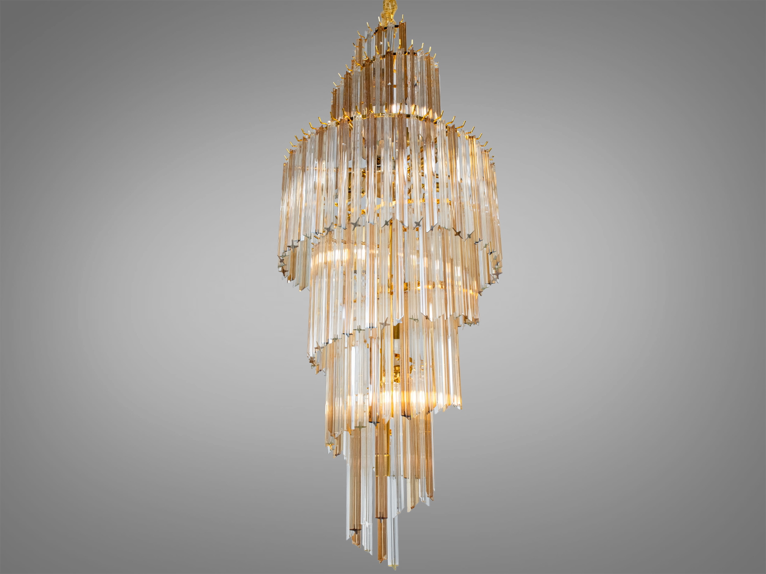 Багатоярусна композиція створена з прозорих кришталевих трубок, які пропускають і розсіюють світловий потік, утворюючи м’які переливи без різких тіней. Хромований метал каркаса додає сучасного характеру та підкреслює геометрію. Враження від предмета близьке до «світлового водоспаду», де кожен елемент працює на загальну глибину картини.