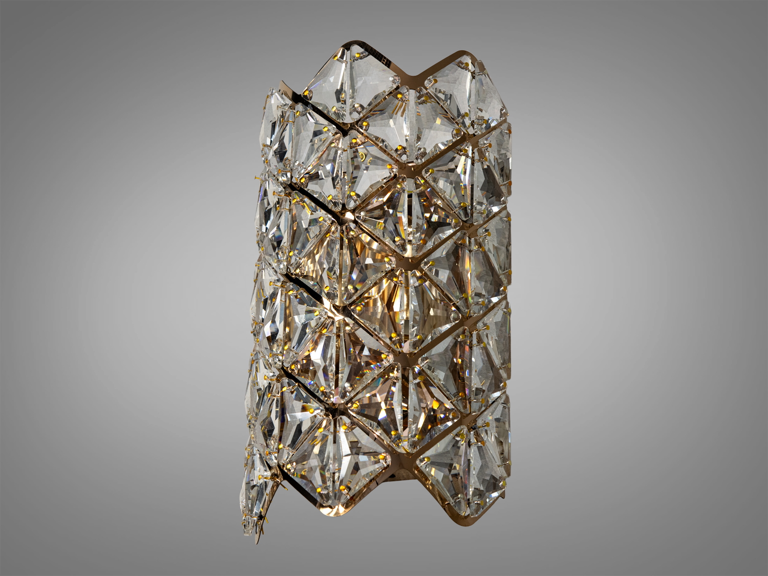 Наше бра виготовлено із золотистої основи, прикрашеної кристалами у формі ромбів, що створюють захоплюючий ефект розсіювання світла. Така конструкція не тільки естетично приваблива, але і забезпечує м′яке, приємне освітлення, ідеально підходячи для створення затишної атмосфери.