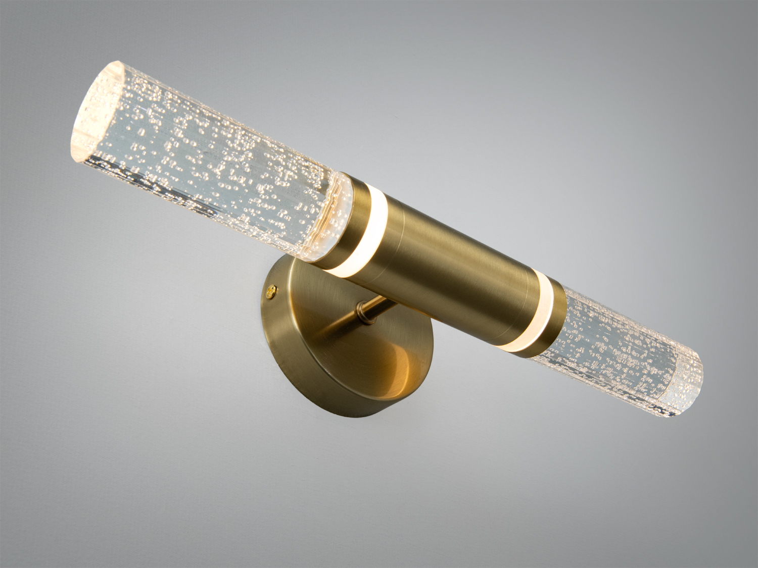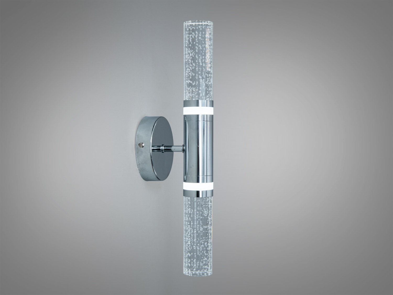 Це настінне бра поєднує мінімалістичний чорний метал і прозорий скляний циліндр з декоративним ефектом бульбашок або кристалічного мерехтіння. Завдяки вертикальній орієнтації воно створює мʼякий спрямований світловий потік уздовж стіни, що може бути доречним для коридорів, зони біля дзеркала, ванних кімнат або спальні. Вбудований LED-модуль 6 Вт забезпечує економне споживання енергії та стабільне підсвічування для щоденних задач.