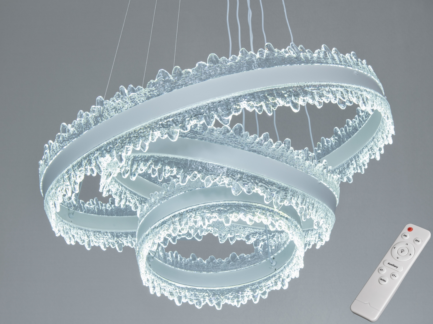 Підвісний світильник з кришталевими кільцями, що створюють ефект хвиль. Оснащений пультом для дистанційного керування яскравістю.Світильник з трьома підвісними кільцями з кришталю, що підходить для сучасних інтер′єрів. Кріплення до стелі на чорній основі.Кришталевий світильник з теплим білим світлом, що надає затишку. Підвісні кільця мають текстуровану поверхню.Люстра LED підвісна чорна 140Вт пульт до 25м²Люстра LED підвісна чорна 140Вт пульт до 25м²