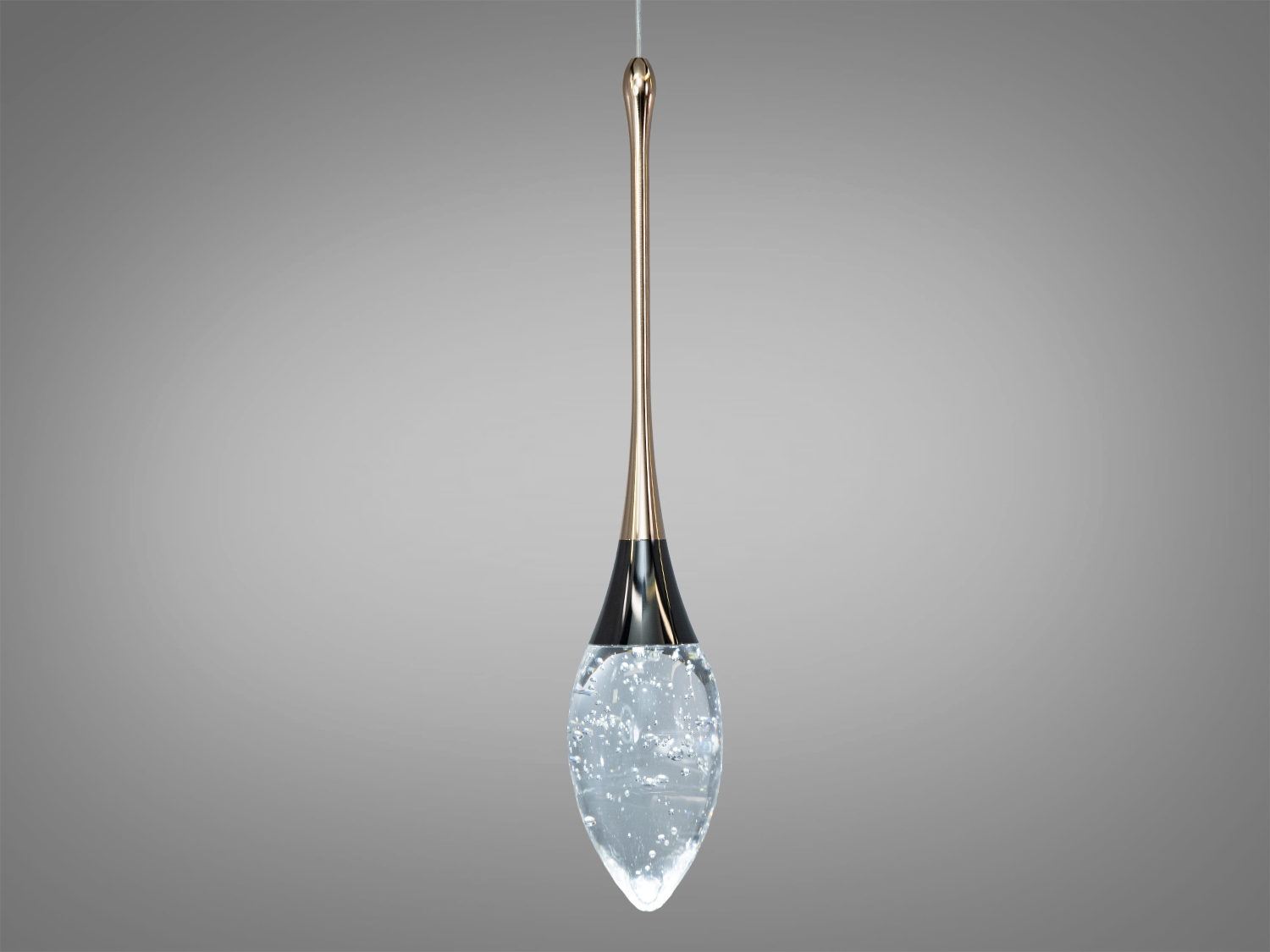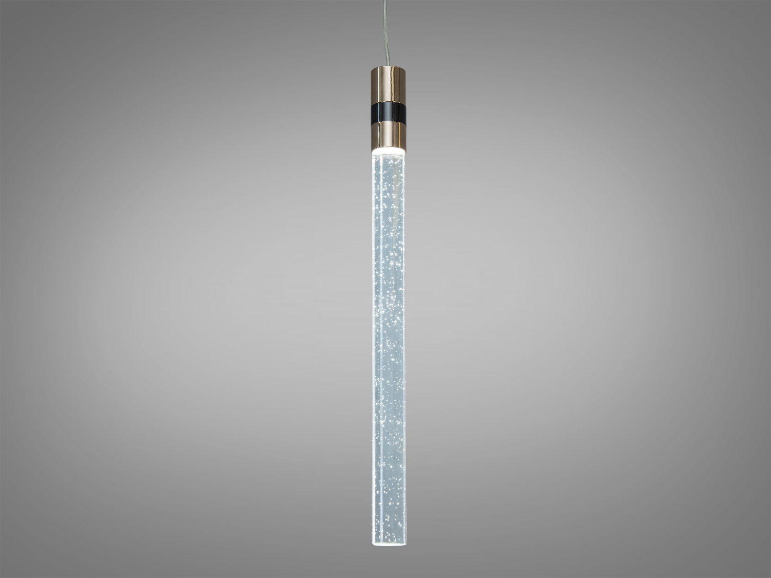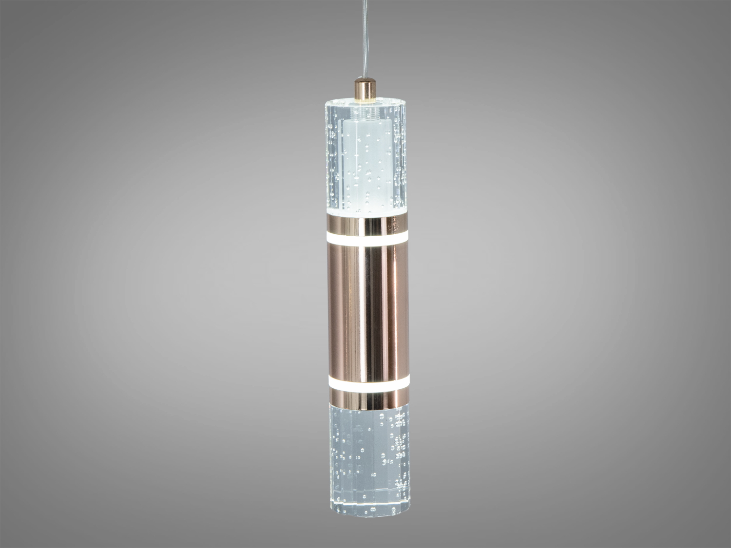 Плафон має витягнуту циліндричну форму з прозорого акрилу, всередині якого помітний ефект «бульбашок». Така структура діє як розсіювач: крапкові відблиски роблять світло м’якшим і додають декоративності без тяжкості масивного скла. Верхня частина виконана з металу в золотому кольорі з фактурним деталюванням — акцент, який підтримує тенденції сучасних інтер’єрів. Завдяки поєднанню «золото + прозорий акрил» підвіс легко комбінується з латунною фурнітурою, дзеркальними або мармуровими поверхнями, теплим або нейтральним оформленням стін.