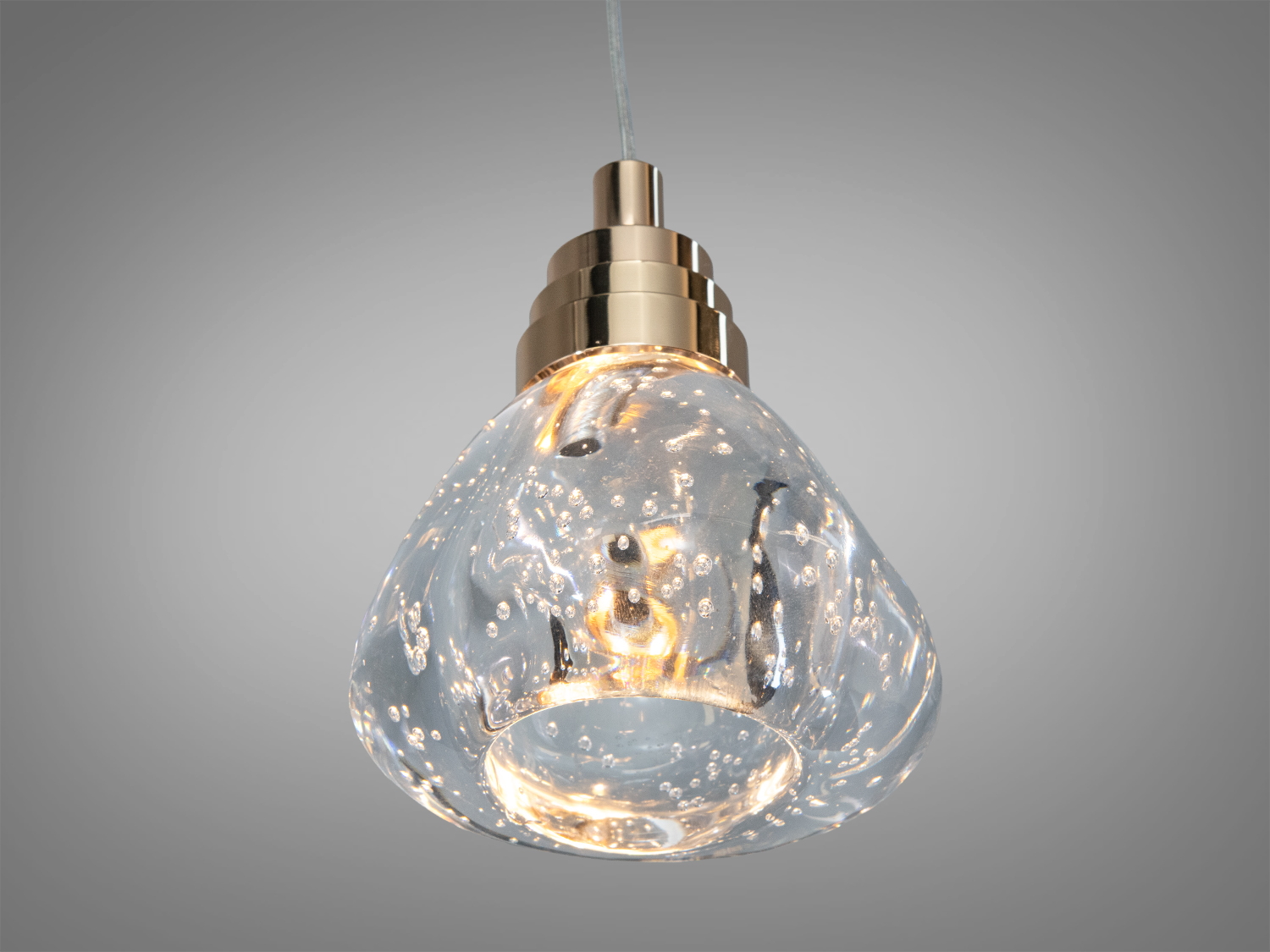 Одинарний світлодіодний підвіс у кольорі золота з прозорим акриловим плафоном з бульбашками — це рішення для акцентного освітлення, де потрібен м’який спрямований потік світла без зайвого засліплення. Вбудований LED-модуль потужністю 4 Вт формує світловий потік приблизно 220 лм, який часто обирають для підсвічування конкретної зони: кавового столика, барної стійки, тумби біля ліжка, журнального столика чи декоративної ніші. Висоту підвішування можна змінювати завдяки довгому шнуру, що допомагає точніше налаштовувати освітлення під інтер’єр і завдання.