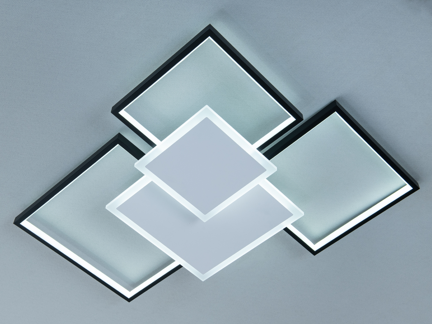 Світильник складається з трьох квадратних панелей різного розміру, що частково перекриваються та розташовані під кутом. Контрастні білі розсіювачі та чорні елементи каркасу підкреслюють мінімалістичну геометрію й пасують до інтер’єрів у стилях мінімалізм, модерн або хай-тек. Низький профіль конструкції візуально «підтягує» стелю і може допомагати підтримувати відчуття простору у кімнатах зі стандартною висотою.