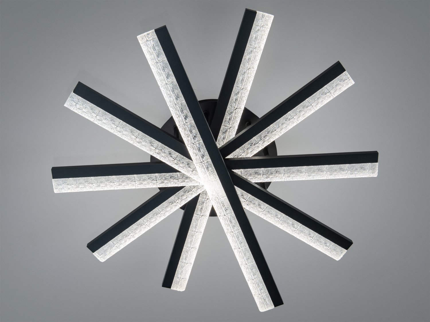 Люстра побудована на основі п’яти чорних планок, що утворюють динамічний, але стриманий силует. Акрилові розсіювачі пом’якшують світловий потік, зменшують ймовірність сліпіння та допомагають уникати різких тіней. Такий підхід корисний для щоденного освітлення — від відпочинку до побутових завдань. На фото виробник може демонструвати тепле, нейтральне або холодне світіння; фактична колірна температура залежить від конкретної модифікації, зазначеної у характеристиках товару. Візуально невеликий профіль виглядає акуратно на стандартних стелях і не перевантажує простір.