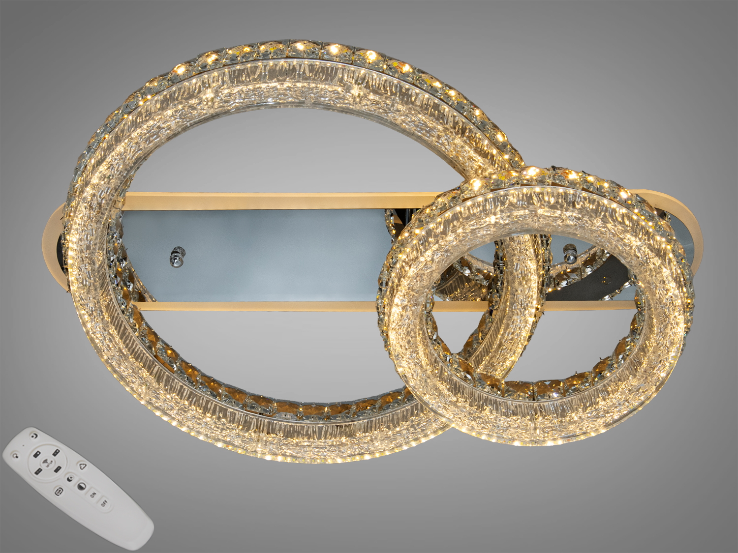 Завдяки поєднанню двох кілець, виразної золотистої основи, потужних вбудованих LED та зручного керування з пульта, ця люстра пропонує гнучкість сценаріїв освітлення — від яскравого робочого до м’якого вечірнього. Оптимальна для кімнат до ≈30 м², коли потрібне рівномірне стельове світло з коректною передачею відтінків і варіативністю кольору.