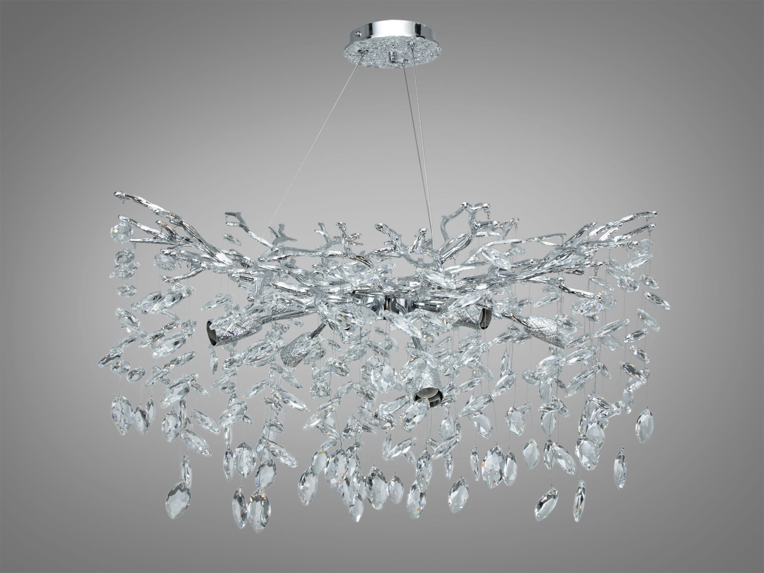 Ця підвісна кришталева люстра створює м’яке багатогранне світло завдяки підвіскам, що нагадують краплі і листя на розгалужених «гілках». Золоте покриття основи підкреслює теплі відблиски кришталю та може працювати як помітний акцент у невеликому інтер’єрі. Конструкція розрахована на чотири лампи з цоколем E14, що за правильного підбору джерел світла зазвичай достатньо для простору приблизно до 8 м².