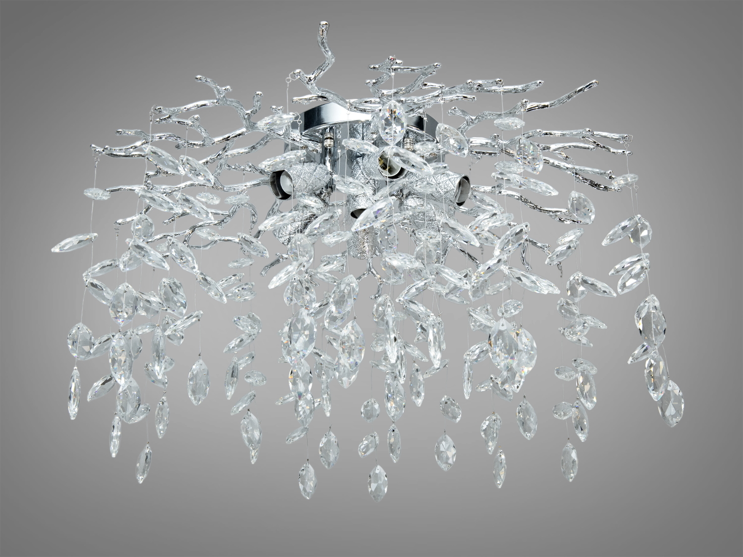 Силует моделі відтворює пластику гліцинії: нитки кришталевих підвісів спадають ярусами та формують виразну об′ємну композицію. Хром працює як дзеркальна підкладка — відбиває світло та підсилює мерехтіння граней, тож навіть м′які лампи дають живу гру відблисків. Каскадна побудова без зайвих декоративних деталей підтримує сучасний прочитаний класики характер та легко інтегрується в різні інтер′єри.