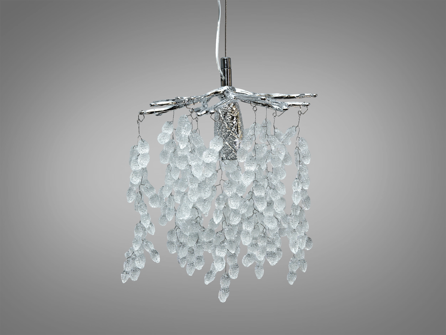 Композиція побудована навколо витягнутої форми з багаторівневими кришталевими підвісками, що асоціюються з гронами винограду або суцвіттями гліцинії. Хромовані елементи візуально підсилюють глибину і блиск кришталю, підкреслюючи фактуру підвісок у денному й штучному світлі. М’які переливи кришталю формують спрямовані відблиски і додають об’єму без перевантаження простору.