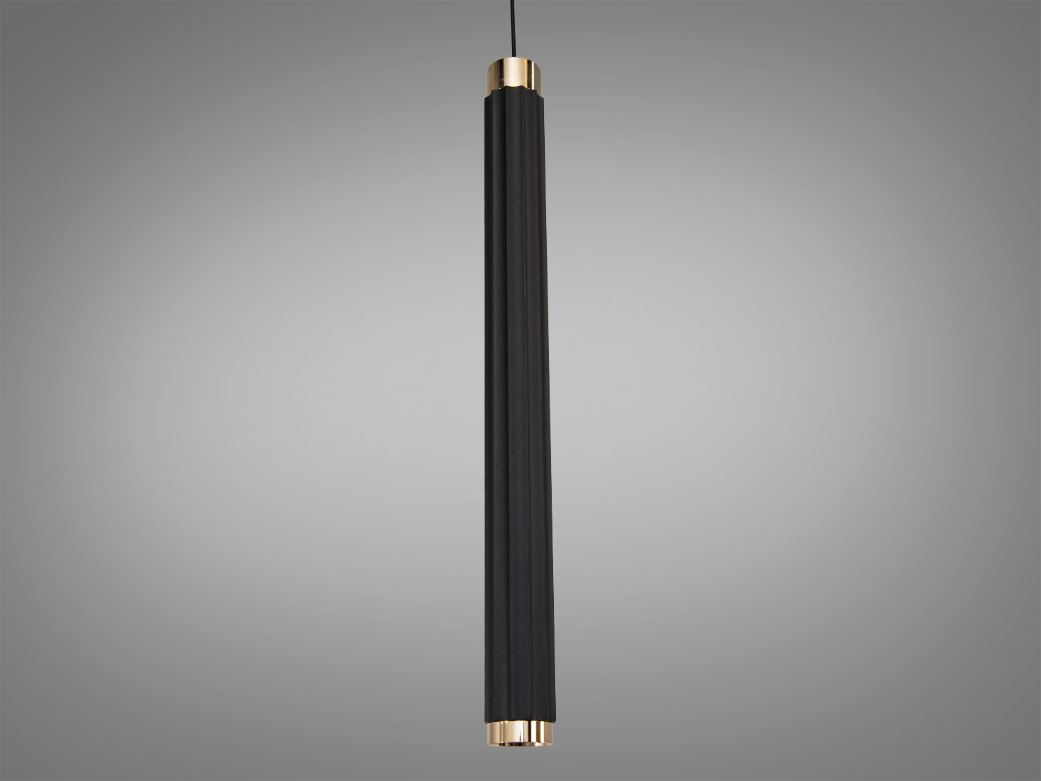 Візуальний акцент формує матовий чорний метал у поєднанні з золотою лінією, що створює легкий контраст без перевантаження простору. Підвіс іде на довгому шнурі, тому його зазвичай можна відрегулювати під час монтажу на потрібну висоту. Спрямована геометрія плафона фокусує світло вниз, що підходить для локального та акцентного освітлення. Така конструкція часто використовується як джерело направленого світла у сучасних інтер’єрах і в комерційних просторах.