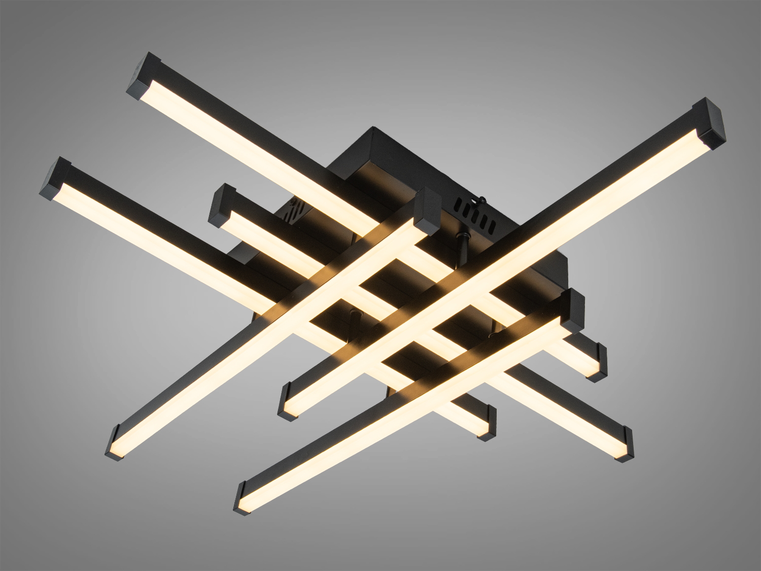 Візуально модель вирізняється перехрещеними лініями LED-панелей, що створюють акуратну геометрію на стелі. Завдяки поєднанню чорного хрому та акрилу світильник гармонійно виглядає у сучасних, мінімалістичних і хай-тек просторах, де важлива чистота форм і зважена графіка.