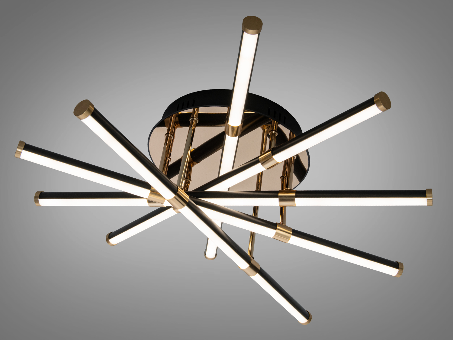 Корпус виконано у чорному матовому відтінку, що пасує до сучасних інтер′єрів і легко комбінується з деревом, бетоном та світлими стінами. Світлові модулі формують геометричну композицію, яка читається як сучасний акцент у просторі. Використано поєднання металу для надійної основи та акрилових розсіювачів для м’якого рівномірного світла без різких відблисків. Конструкція виглядає акуратно біля стелі та не перевантажує кімнату.