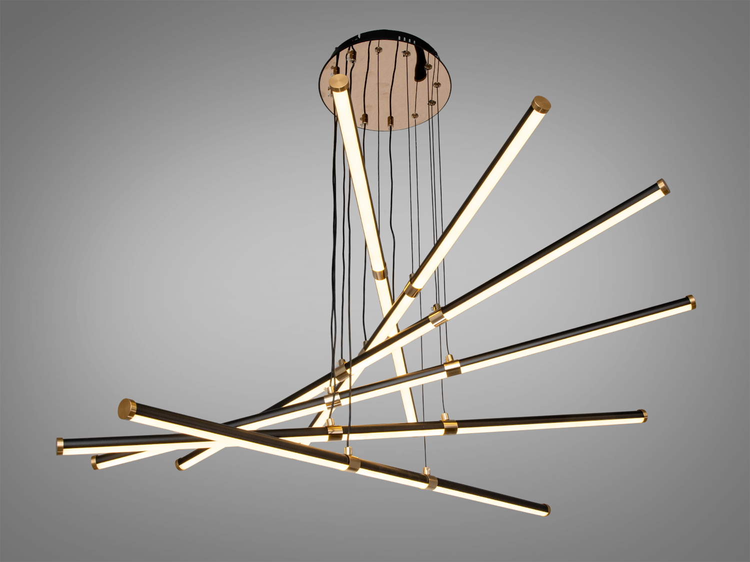 Лінійний підвісний світильник у чорному кольорі пропонує продумане базове світло для кімнат площею орієнтовно до 13 м2. Завдяки вбудованим LED-модулям сумарною потужністю 78 Вт модель створює яскравий, м’яко розсіяний потік без нав’язливих відблисків. Витягнута форма й чітка геометрія допомагають візуально упорядкувати простір, а золотисті акценти на чорному каркасі додають сучасного характеру.