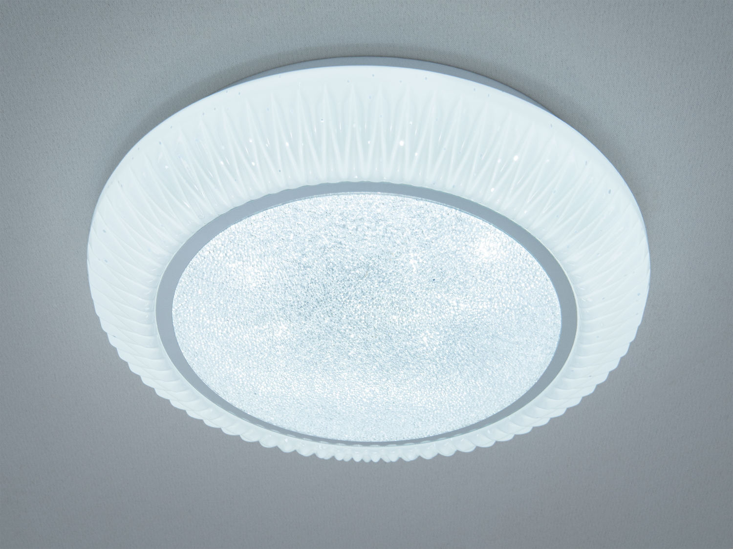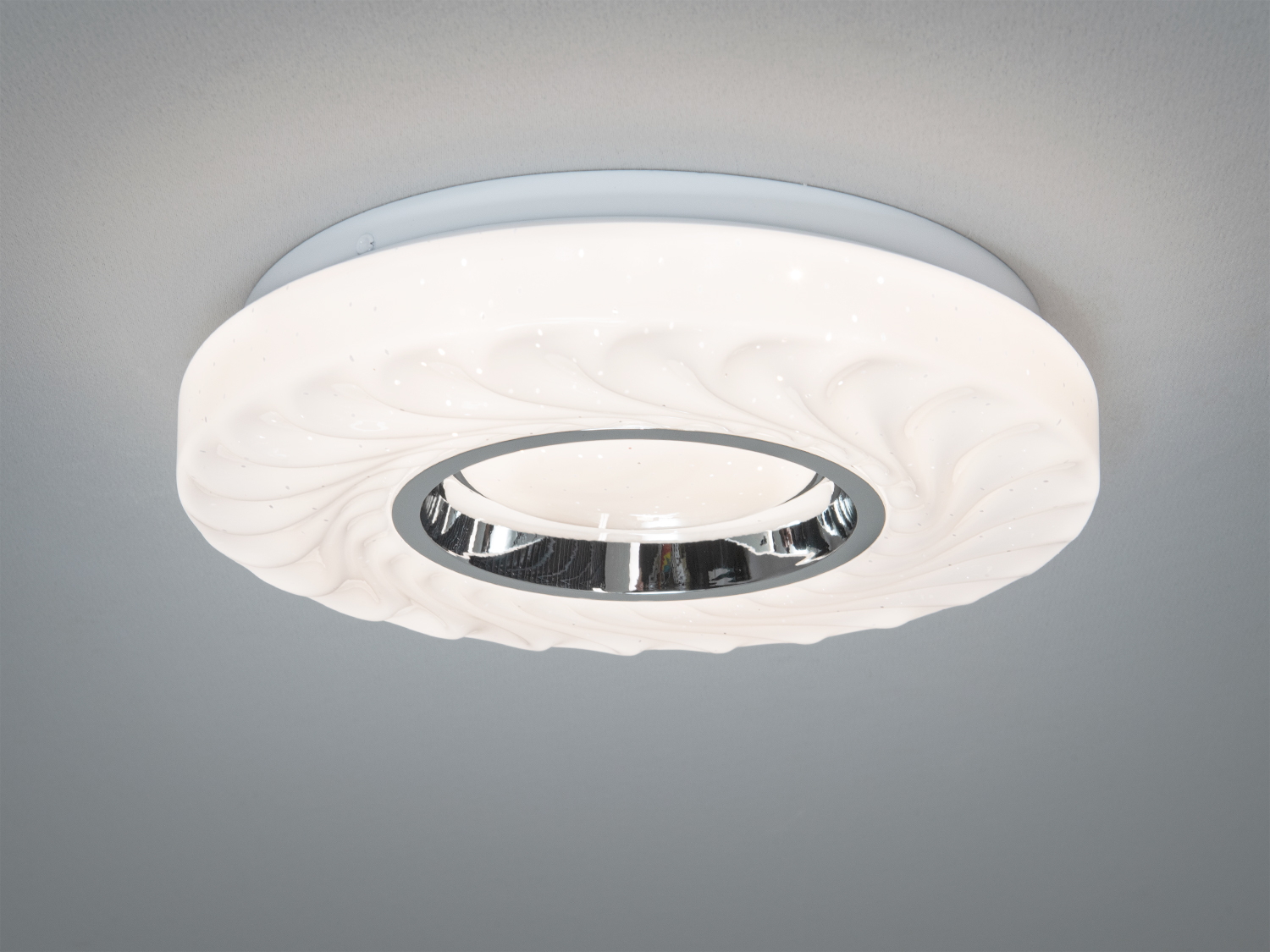 Ця стельова LED-люстра поєднує низькопрофільну конструкцію з рівномірним м’яким світлом. Круглий плафон з фактурного/рельєфного скла та акуратний хромований акцент візуально полегшують світильник і допомагають створити комфортне загальне освітлення у невеликих кімнатах. Модель належить до сегменту LED люстр і світлодіодних панелей, передбачає встановлення на стелю та керується звичайним настінним вимикачем — без пульта.