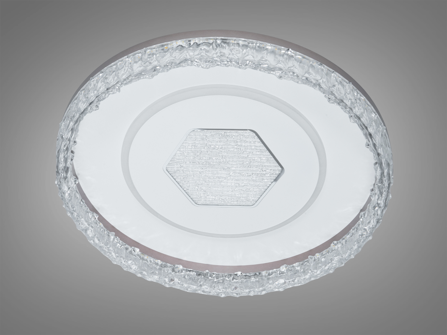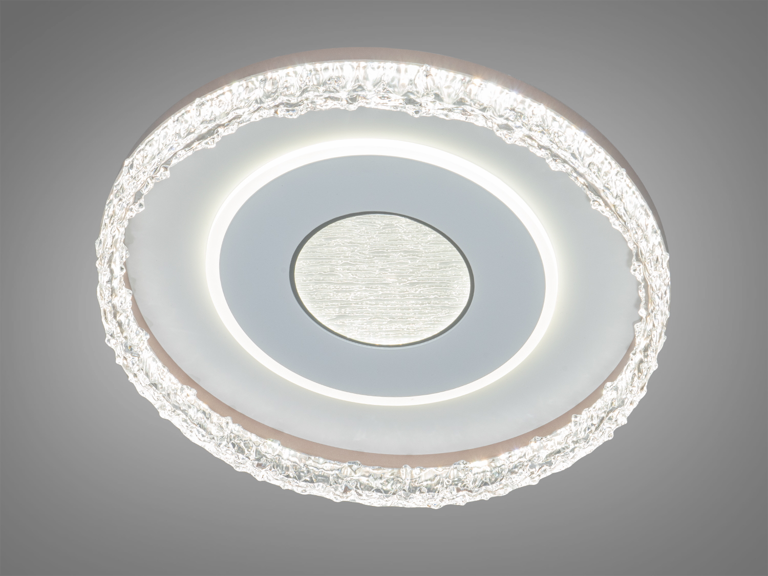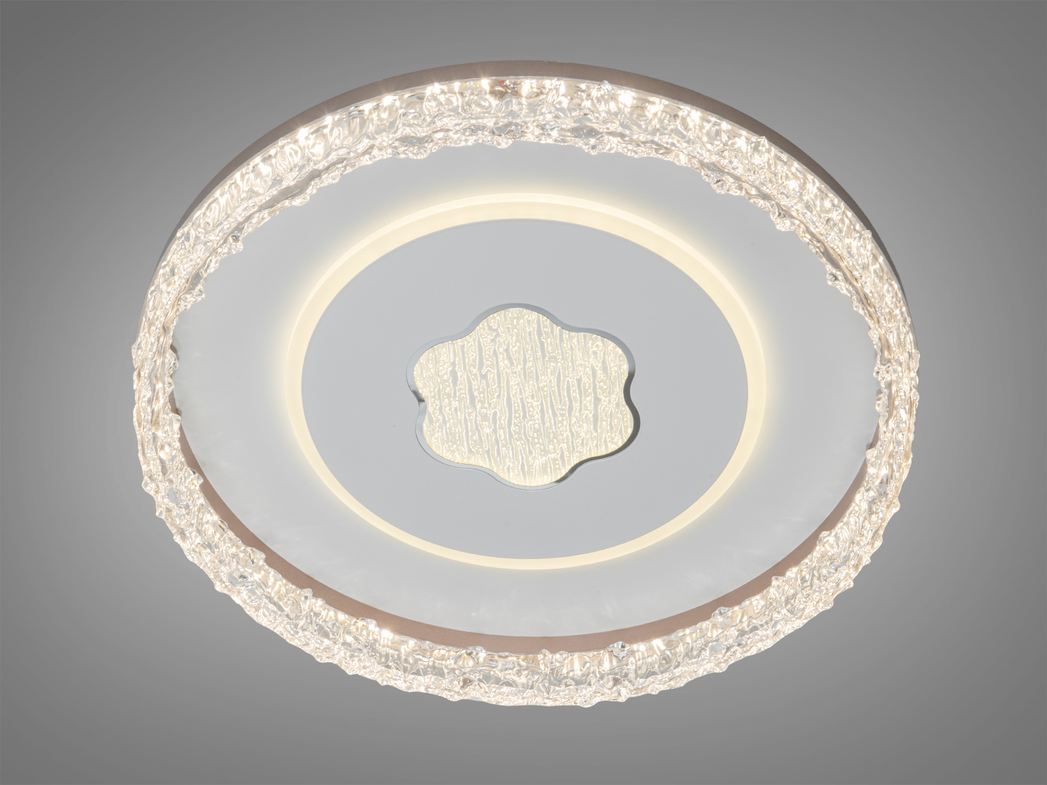 Стельовий світлодіодний світильник Diasha 85 Вт у форматі білого кола створює базове рівномірне освітлення для житлових і робочих приміщень. Матовий плафон м’яко розсіює потік, а прозорий кант із кришталевим ефектом додає глибини світіння без різких відблисків. Накладний монтаж зберігає висоту кімнати, тому модель часто обирають для низьких стель і мінімалістичних інтер’єрів. Світильник працює від звичайного настінного вимикача; пульт у комплект не входить.